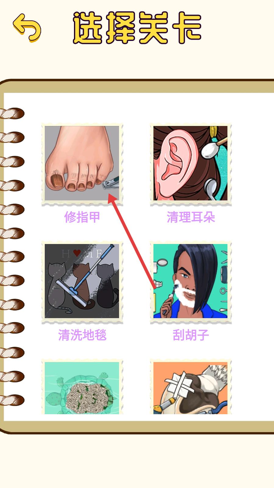 2、进入关卡选择界面后,会看到包含修指甲、清理耳朵等在内的多个关卡选项,找到修指甲对应的选项并点击,即可进入修指甲的游戏环节。