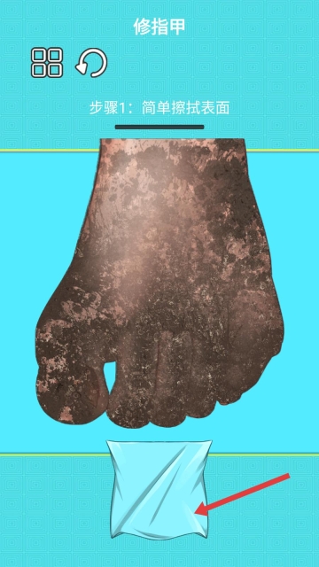 进入修指甲的游戏环节后,界面会呈现步骤1的内容——简单擦拭表面,其下方配有擦拭工具;按照相应提示,操作该擦拭工具对脚部进行擦拭,即可启动修指甲的流程。