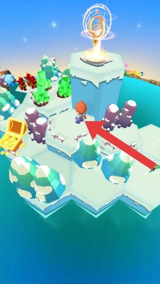 2、画面采用卡通风格绘制冰雪场景,包含角色、宝箱、彩色晶体、传送装置等发光物体元素,红色箭头指向角色,是探索闯关类的玩法场景。