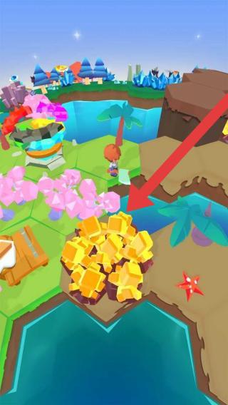 1、画面是卡通风格的场景,包含角色、黄色矿石堆、粉色花朵、水域、树木、建筑等元素,这是该游戏里探索采集类玩法的场景。