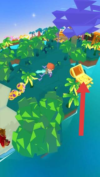 3、画面采用卡通风格展现丛林场景,包含手持武器的角色、宝箱、彩色蘑菇、各类植物以及水域等元素,是一个以探索寻宝为核心玩法的游戏场景。