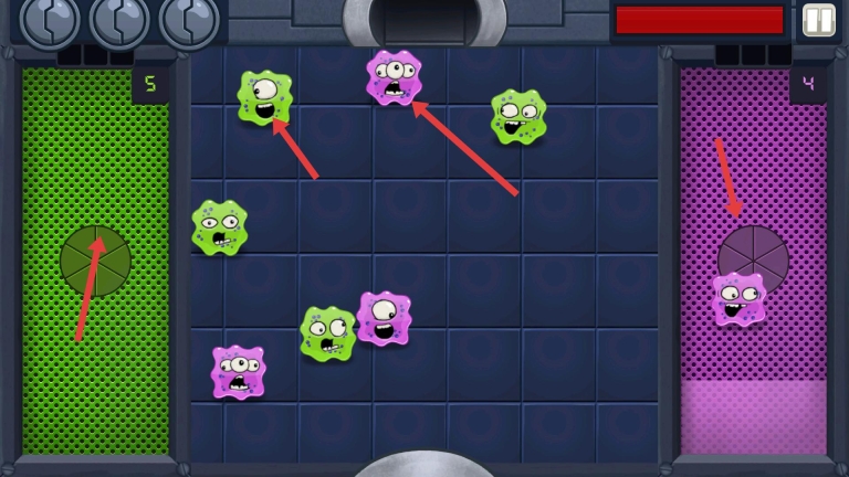 2、在关卡里引导病毒前往对应颜色的区域,借助箭头指示进行精准操作,防止病毒随意移动,保证分类收纳到位。