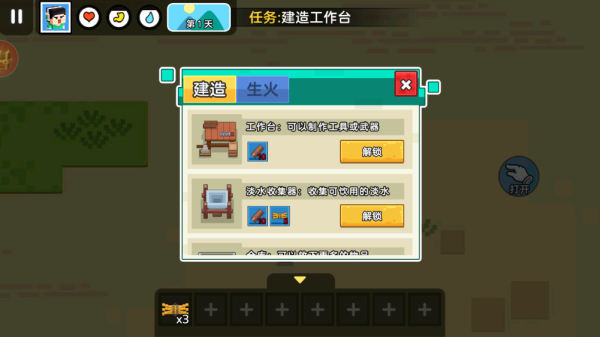 4、最后通过合成关键部件来搭建烽火台,触发求救信号,历经重重挑战后,成功从这片像素世界中逃脱!