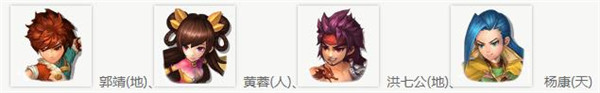 郭靖(地)、黄蓉(人)、 洪七公(地)、岳飞(天)