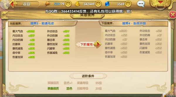 英雄升阶后,品质会得到提升,此时心法栏里的所有经书都会消失,其属性加成会直接整合到人物自身属性中,同时心法栏会自动切换到下一阶段。