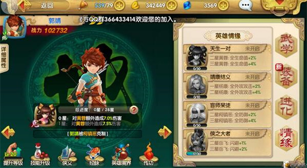郭靖:前面提到过掉落的情况,和上个阵容不一样的是,情缘组合只有与黄蓉的“天生一对”、与岳飞的“侠之大者”这两组。
