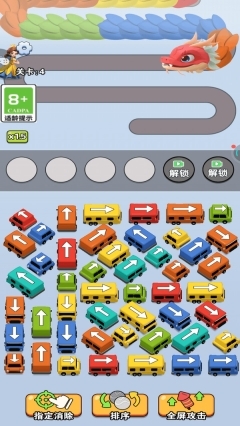 3、碰到龙形障碍时,先消除周围的小车,让路径得以绕开,不要强行对抗,稳扎稳打更容易通关。