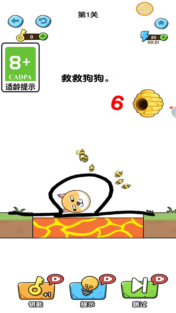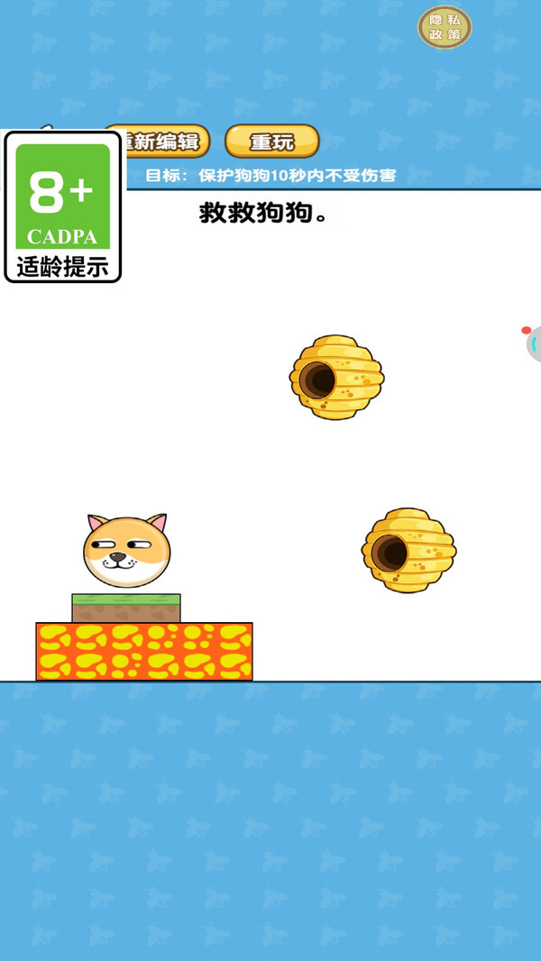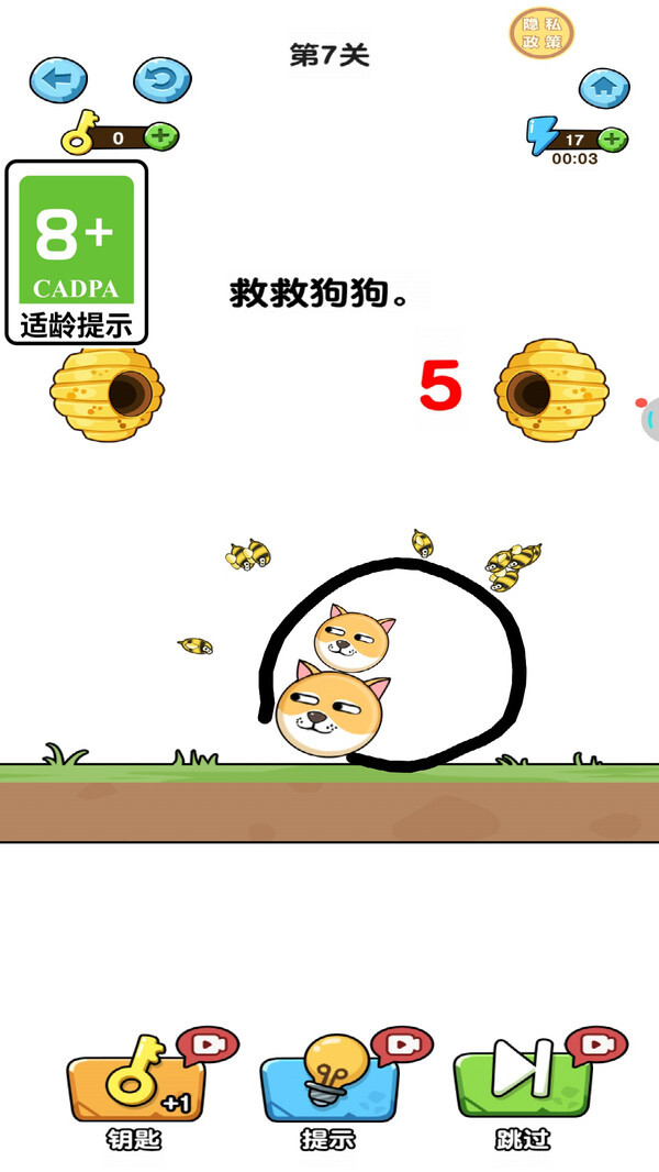 《汪星人救援日记》是一款轻松有趣的益智休闲游戏。在游戏中,玩家需通过划线的方式,为可爱的狗头筑起防线,使其免遭蜜蜂的侵袭。游戏操作简单易懂,却不失挑战性——你得快速做出反应,巧妙规划防御路线,全力阻拦蜜蜂靠近狗头。而随着关卡逐步深入,蜜蜂的数量与飞行速度都会不断提升,这无疑是对玩家策略思维和操作手速的双重考验。