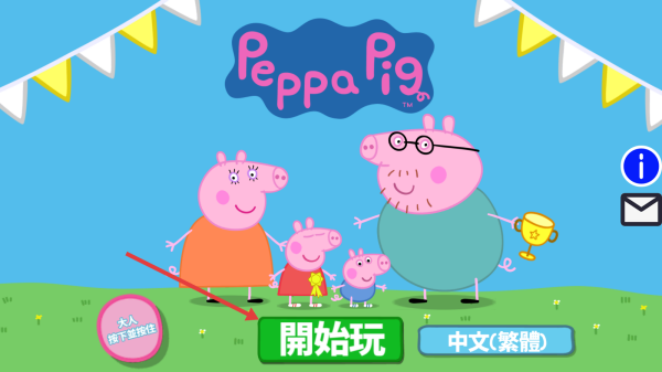 1、点击开始玩按钮进入游戏,游戏以小猪佩奇及其家人朋友为主角,构建了一个充满童趣的游戏世界。