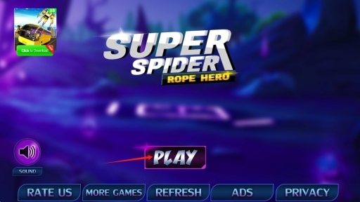 1、在Super-Spider-Rope-Hero界面,点击PLAY按钮,开启城市冒险之旅,化身为绳索英雄,点击按钮即可开始游戏。