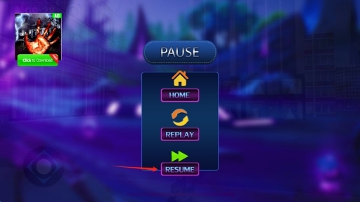 3、游戏暂停时,点击RESUME按钮可继续当前游戏进程;若需要重新游玩,点击REPLAY即可;若想返回主界面,则选择HOME按钮,点击对应按钮即可继续操作。