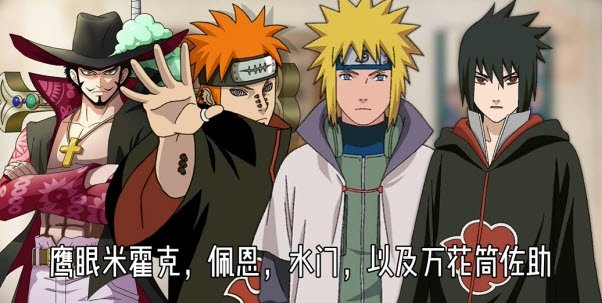 佩恩[天道]、宇智波带土[忍界大战]、神秘面具男、宇智波佐助[须佐能乎]、波风水门[青年]