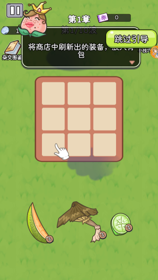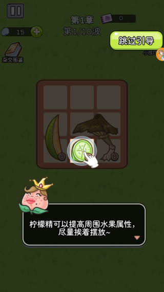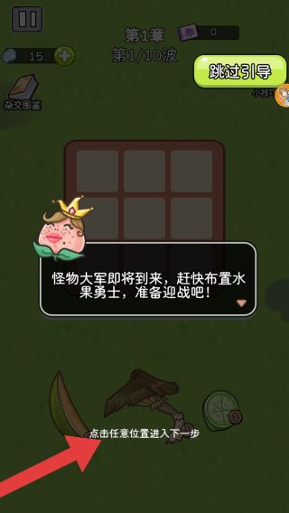 1、进度显示、功能按钮(如跳过引导、杂交图鉴)、金币数量、提示文本等元素,共同构成了初始关卡的引导场景,这属于休闲塔防类游戏玩法,玩家需要通过布置水果来抵御一波波来袭的怪物。