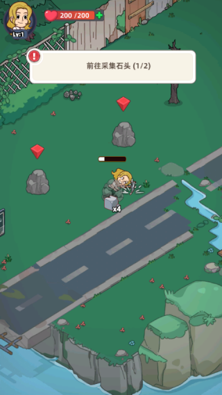 1、玩家需要收集周边的石头,积累到足量的石头后就能打造新工具,进而加快采集效率。