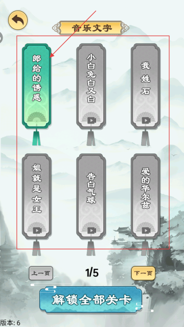 1、启动游戏后,进入【音乐文字】界面,选择歌曲《郎给的诱惑》,即可进入歌词拼接关卡。