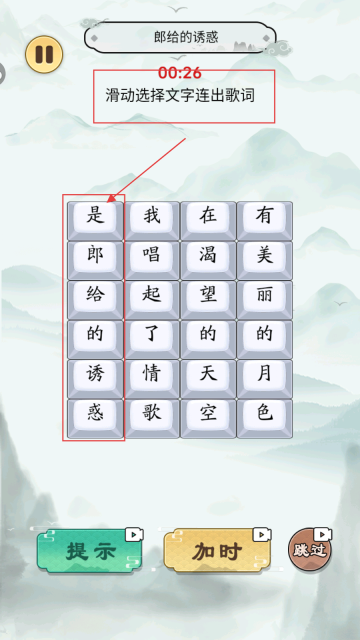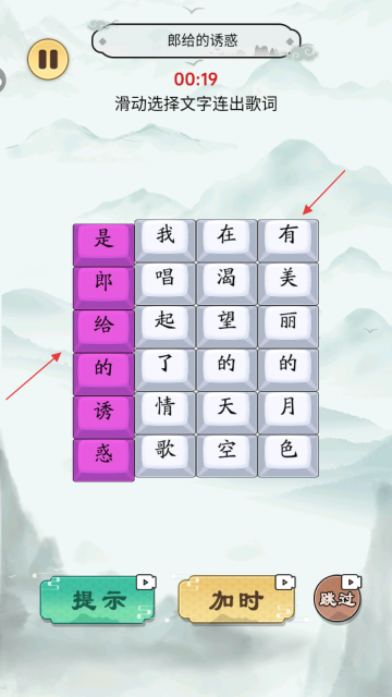2、依据“滑动选择文字连出歌词”的规则,找出与“是郎给的诱惑”相对应的文字块。