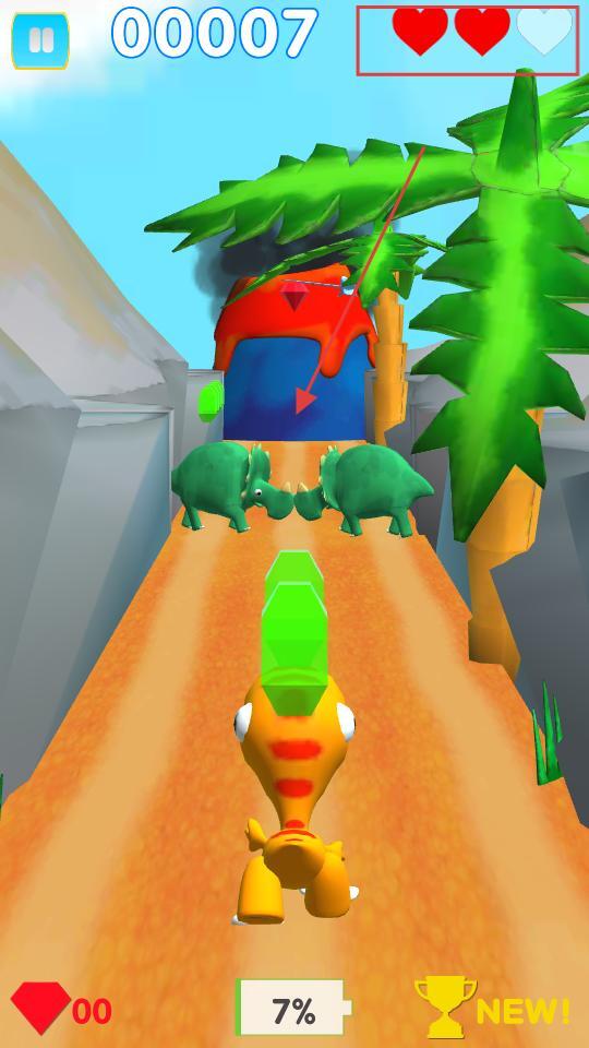 4、在前进的过程中,会遇到成对出现的绿色三角龙之类的障碍,你需要操控小恐龙躲开它们,同时还能收集绿色的宝石,以此积累分数和推进进度,不断朝着关卡的更深处前进。