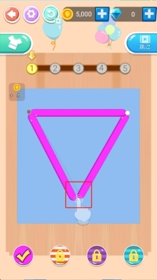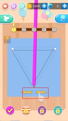 1、游戏开始时,按照提示拖动下方的左右箭头,调整粉色线条的走向,让它贴合三角形的轮廓,这样就能引导气球完成塑形。
