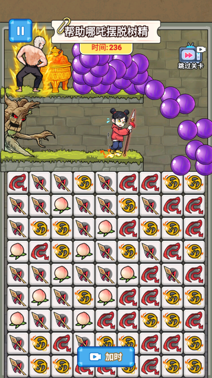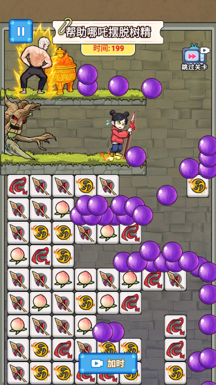 3、需在规定时间内完成消除任务,助力哪吒摆脱树精等敌人的追捕,顺利通关以解锁后续关卡。