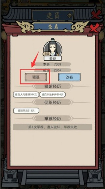 1、先打开【吏员】或【家属】选项,从中找到想要驱逐的对象