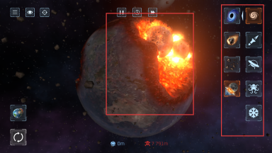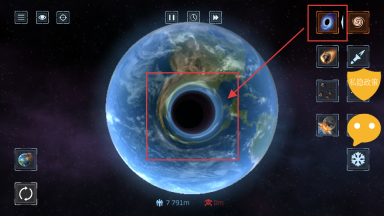 2、点击右侧的黑洞武器,将其放置在星球表面,黑洞会吞噬星球物质,持续进行破坏,直到满足摧毁条件,以此推进游戏进程。