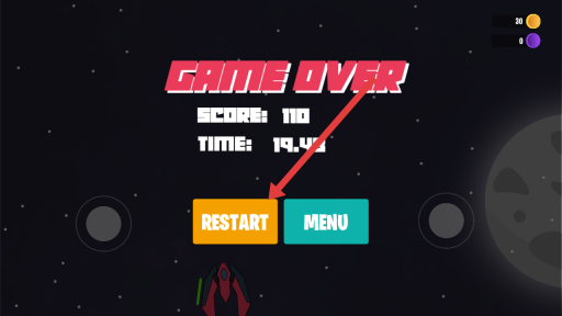 3、当被敌方战机攻击至血量耗尽导致游戏失败后,点击橙色的RESTART按钮,即可重新开启关卡挑战更高分数。