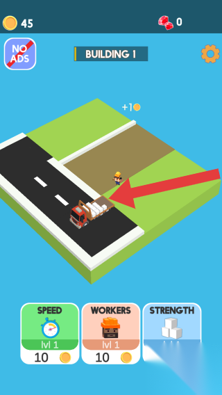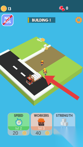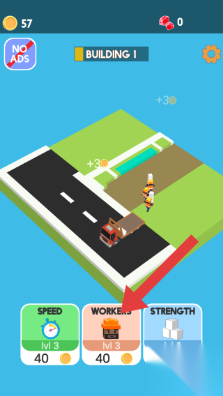 1、实体信息包含“BUILDING1”与“NOADS”,同时设有速度、工人、力量的升级界面,展现的是建筑施工场景,归属于休闲模拟建造类型,玩家能够借助升级属性来推动建筑进程。