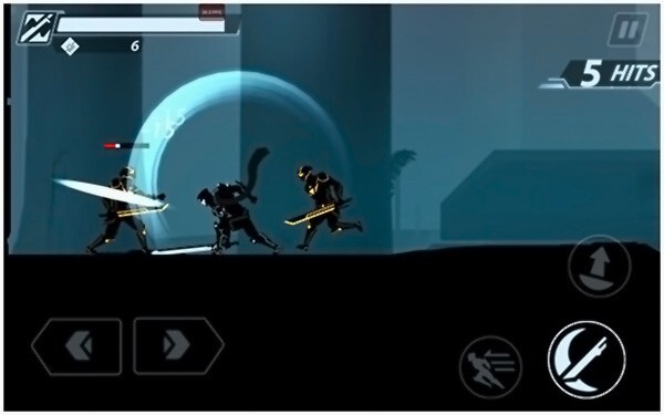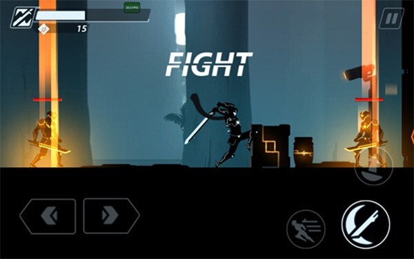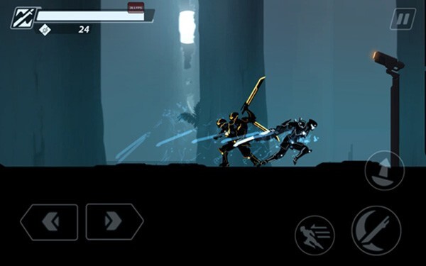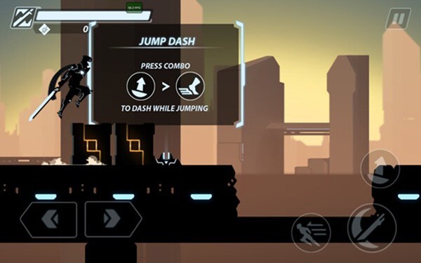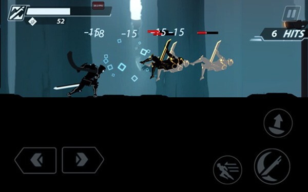 进入超速暗影忍者复仇游戏后,我们会直接进入游戏场景,屏幕左下角的两个按钮可操控主角左右移动,右下角则设有攻击、跳跃和瞬移按钮,点击这些按钮就能进行战斗操作。