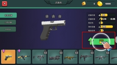 2、进入武器库界面查看枪械的各项属性,找到并点击升级按钮,通过消耗金币来提升枪械的伤害、射速等性能指标,从而增强自身的战斗力。