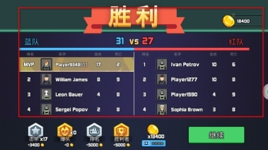 4、当对战结束且所在队伍取得胜利时,会出现胜利界面,该界面会展示队伍及个人的击杀数与死亡数等数据,玩家同时还能获得金币奖励。