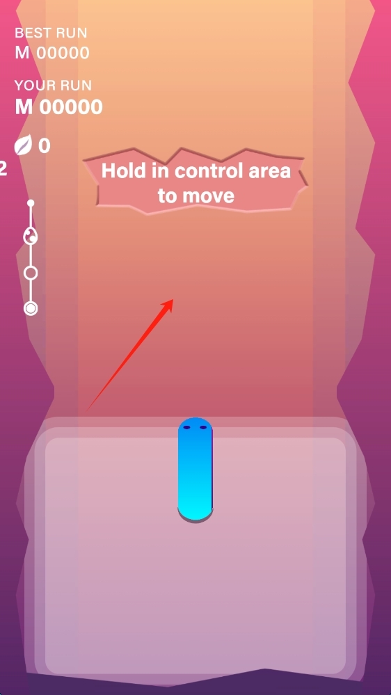 1、进入启动界面后,按住控制区域操控蓝色长条角色移动,开启跑酷挑战,通过滑动操作开始游戏。