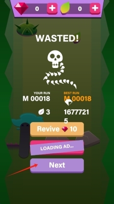 3、在失败界面中,玩家可以选择用钻石复活(点击Revive),也可以点击Next重新开始跑酷,继续挑战更高分数。