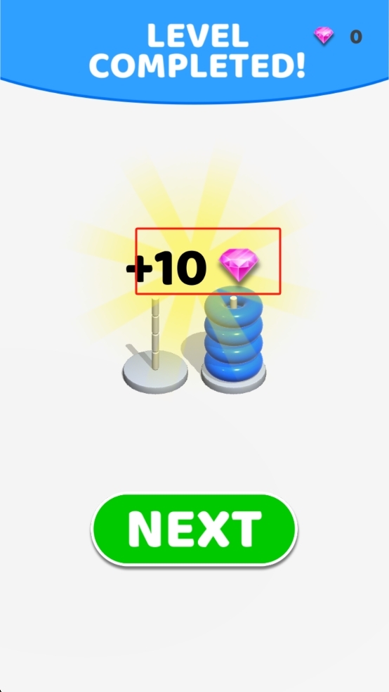 3、完成关卡后,界面会显示获得10颗钻石的奖励,点击底部的绿色按钮,就能进入下一关,挑战难度更高的圆环堆叠任务。