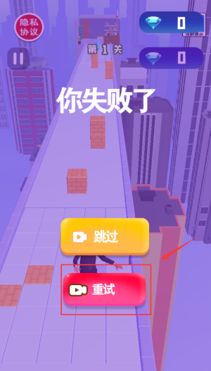 3、失败后点击重试继续游戏,或选择跳过当前关卡。