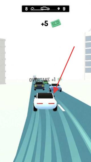 1、在车道场景下,操控白色车辆完成超车动作,即可触发【OVERTAKE+1】;过程中需收集绿色钞票,避开其他车辆,以此推进关卡进度。