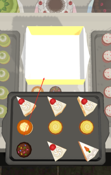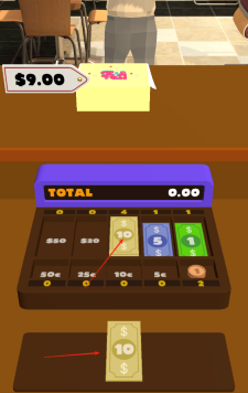 3、所有商品都完成装饰并装盒后,前往收银台点击一下,就能把顾客的钱收入收银机,此时上方会显示需找的零钱金额。要是一块钱的零钱不够,可将旁边的整钱拖到一块钱的格子里,整钱就会兑换成一块钱的零钱。