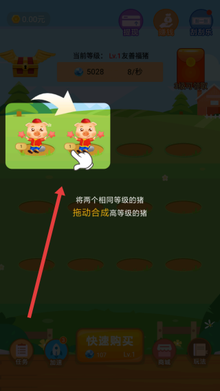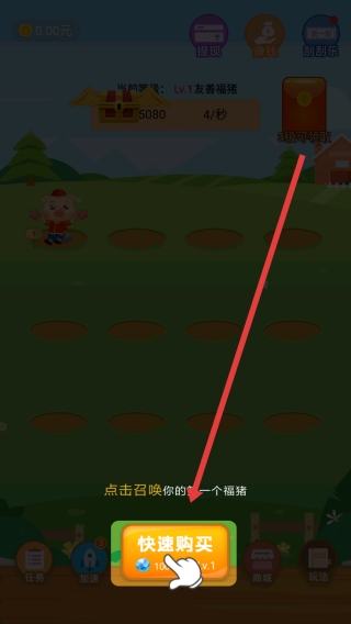 1、在游戏界面中点击快速购买按钮,消耗相应道具召唤福猪,以此增加可用于合成的基础小猪数量。