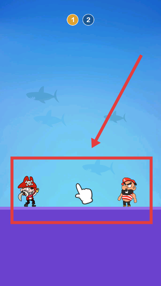 1、进入游戏关卡后,会看到蓝色背景中有两个海盗,按照手指的指引,点击对应的位置,就能触发关卡的挑战内容。