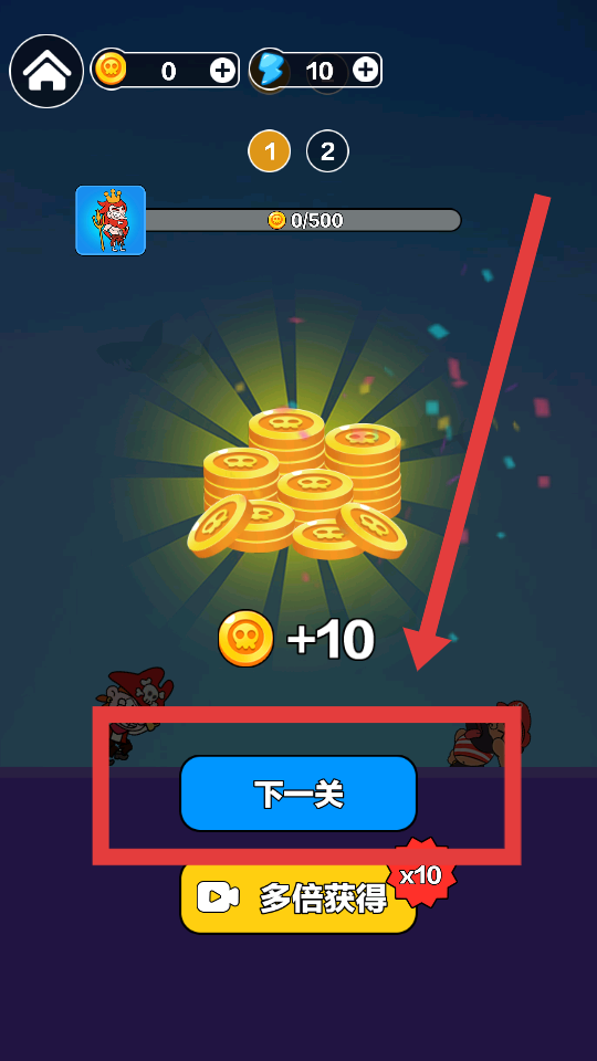 2、挑战成功完成后,界面会弹出一堆金币和下一关按钮,点击蓝色的下一关按钮,即可进入新的关卡。