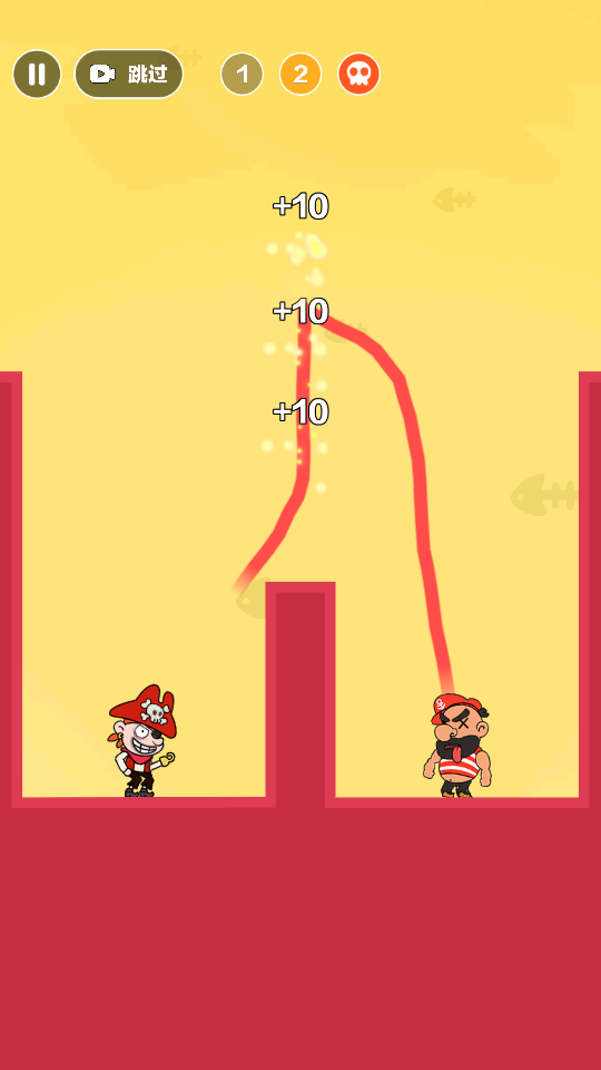 3、在新关卡里,按照画面给出的提示,画出红色线条来连接两个海盗,这样海盗就能依靠线条越过障碍,顺利完成关卡任务。