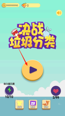 1、启动游戏后,映入眼帘的是“决战垃圾分类”的标题与播放按钮,点击黄色按钮即可进入垃圾分类关卡;消耗金币和体力值开启挑战,将各类垃圾准确归类,就能获得相应奖励。