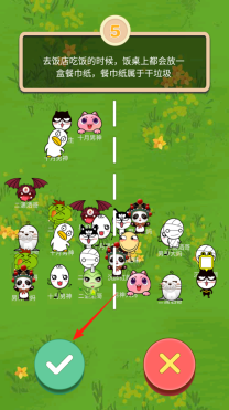 3、新关卡的题目设定为“餐巾纸属于干垃圾”,你需要在卡通角色里找出对应干垃圾的代表角色,选好后点击绿色对勾按钮。如果答对了就能继续挑战下一题,要是答错就得重新来过,这样在玩的过程中就能学习垃圾分类知识,慢慢积累相关常识。