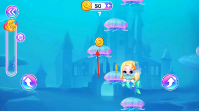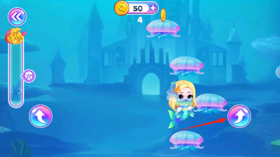 2、在水下时,要避开那种紫色透明的水母;点击向上键右侧的按钮进行跳跃,同时收集黄色圆形的金币。