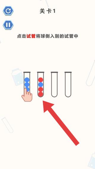 2、进入游戏内的关卡1后,需依据文字提示进行操作:点击试管,将球倒入其他试管,从而把两种颜色的球区分开来。