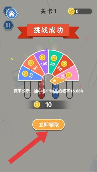 3、当关卡1挑战成功的提示出现后,玩家既能选择额外参与抽奖环节,也可通过点击“立即领取”直接跳转至下一关的场景开启游玩。