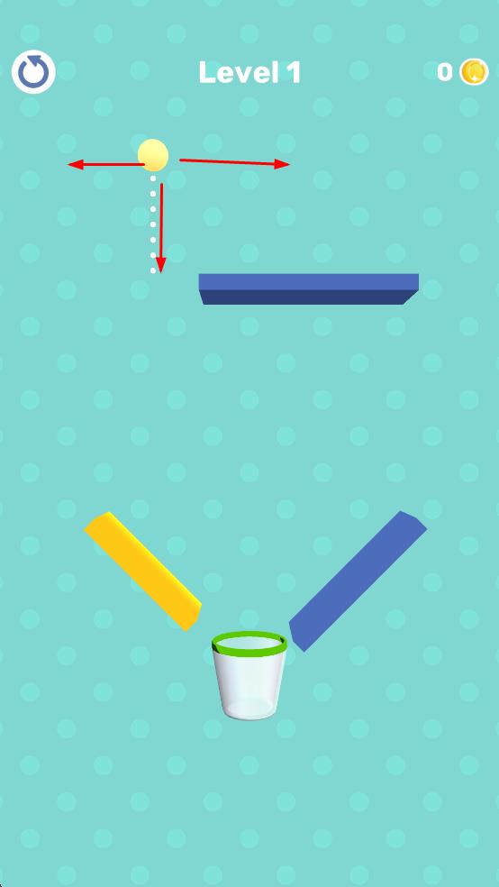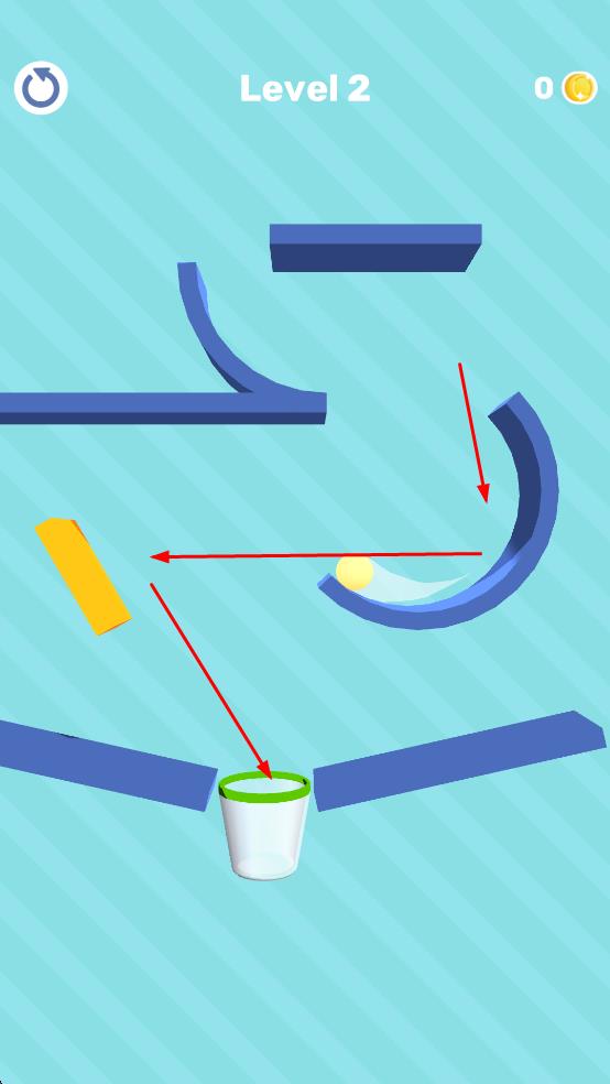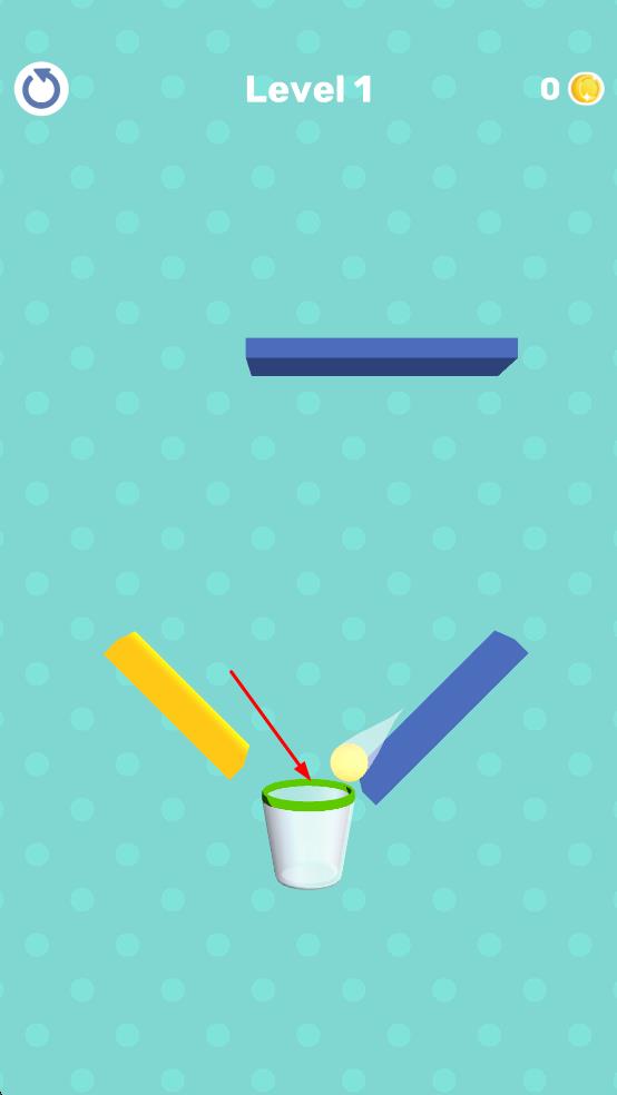1、操控黄色球体从上方落下,引导它在蓝色与黄色的平台上滚动,使其最终掉入下方的白色杯子里。