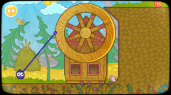 1、控制毛蛋靠近水车,点击屏幕使毛蛋伸出紫色手臂粘在水车上,借助水车的转动,让毛蛋朝着糖的方向移动。