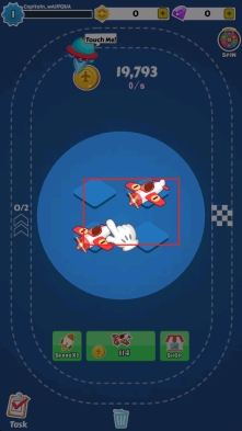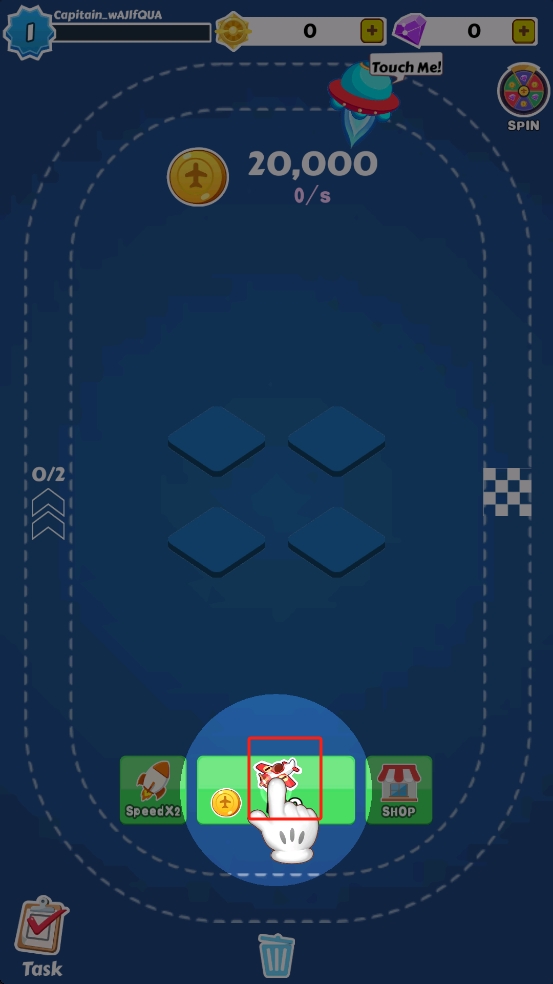 1、进入初始界面后,点击底部红框中的飞机图标,消耗金币将飞机投放到跑道上,飞机便会自动飞行获取金币,以此来积累资源。