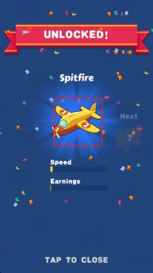 3、通过合成解锁新飞机Spitfire,查看它的速度和收益属性,确认无误后点击“TAP TO CLOSE”按钮关闭界面,然后使用这架新飞机继续赚取金币。