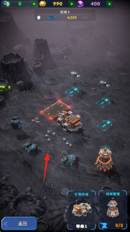 1、在区域1的地图中,操控机甲建造矿物存储设施与炮塔,点击蓝色采矿点的箭头位置,派遣无人机去采集金币和水晶这两种资源。